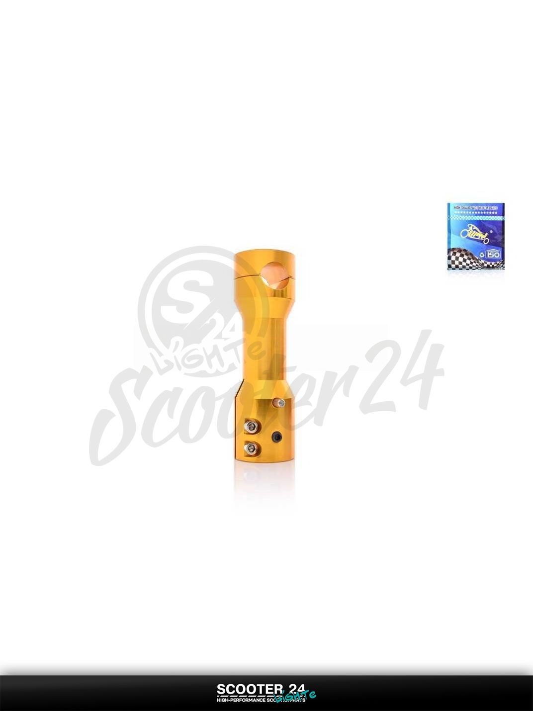 Универсальный вынос LIPAI для открытого руля позволяет установить прямой руль Ø22 мм на скутер с траверсой d22–24. Жесткие стойки и прижимные скобы обеспечивают надежную фиксацию без проворотов, желтое анодированное покрытие защищает от коррозии и подчеркивает внешний вид. Длина L155 подобрана для удобной эргономики и контроля, что особенно заметно при активной городской езде и на неровностях.