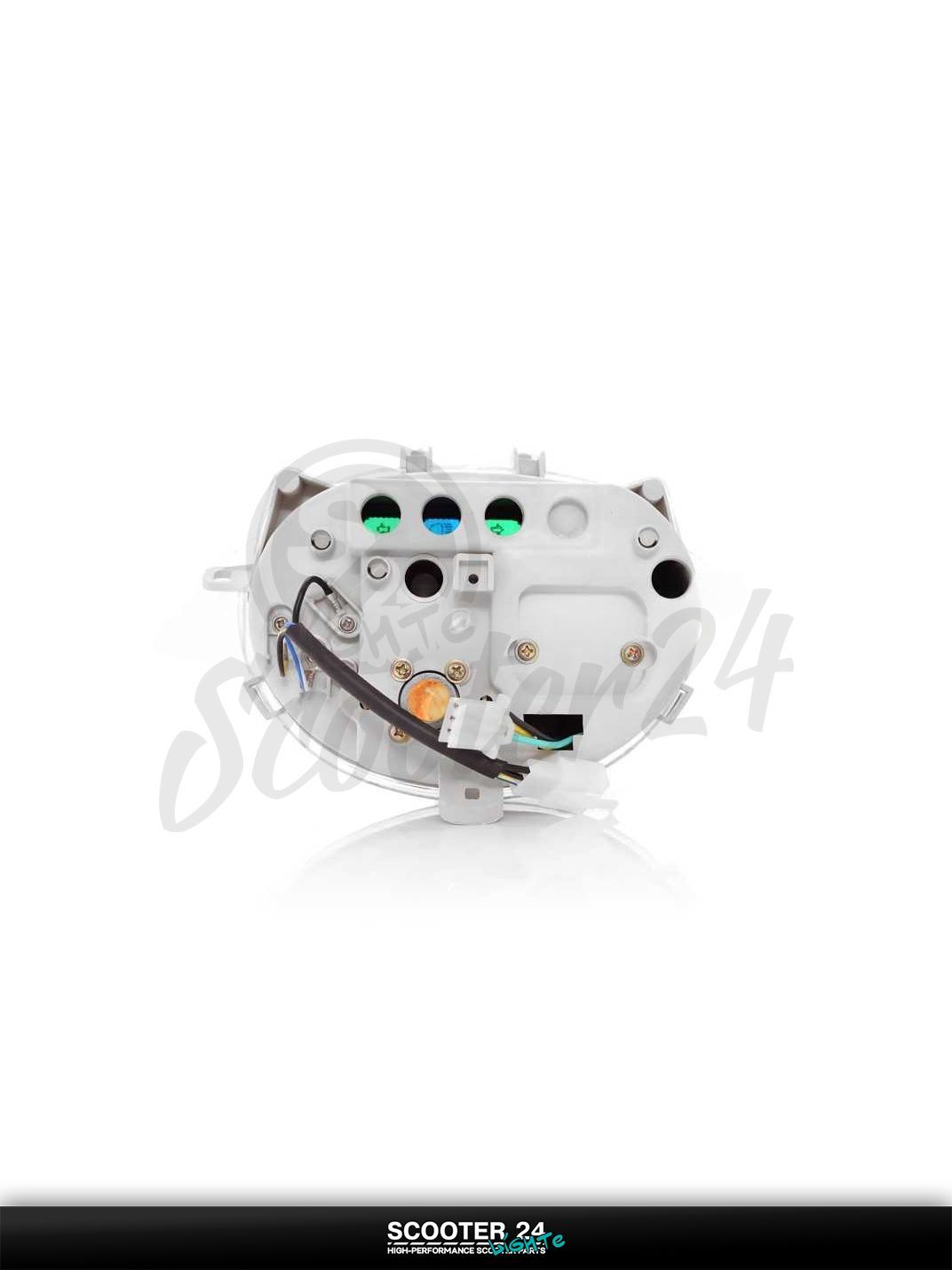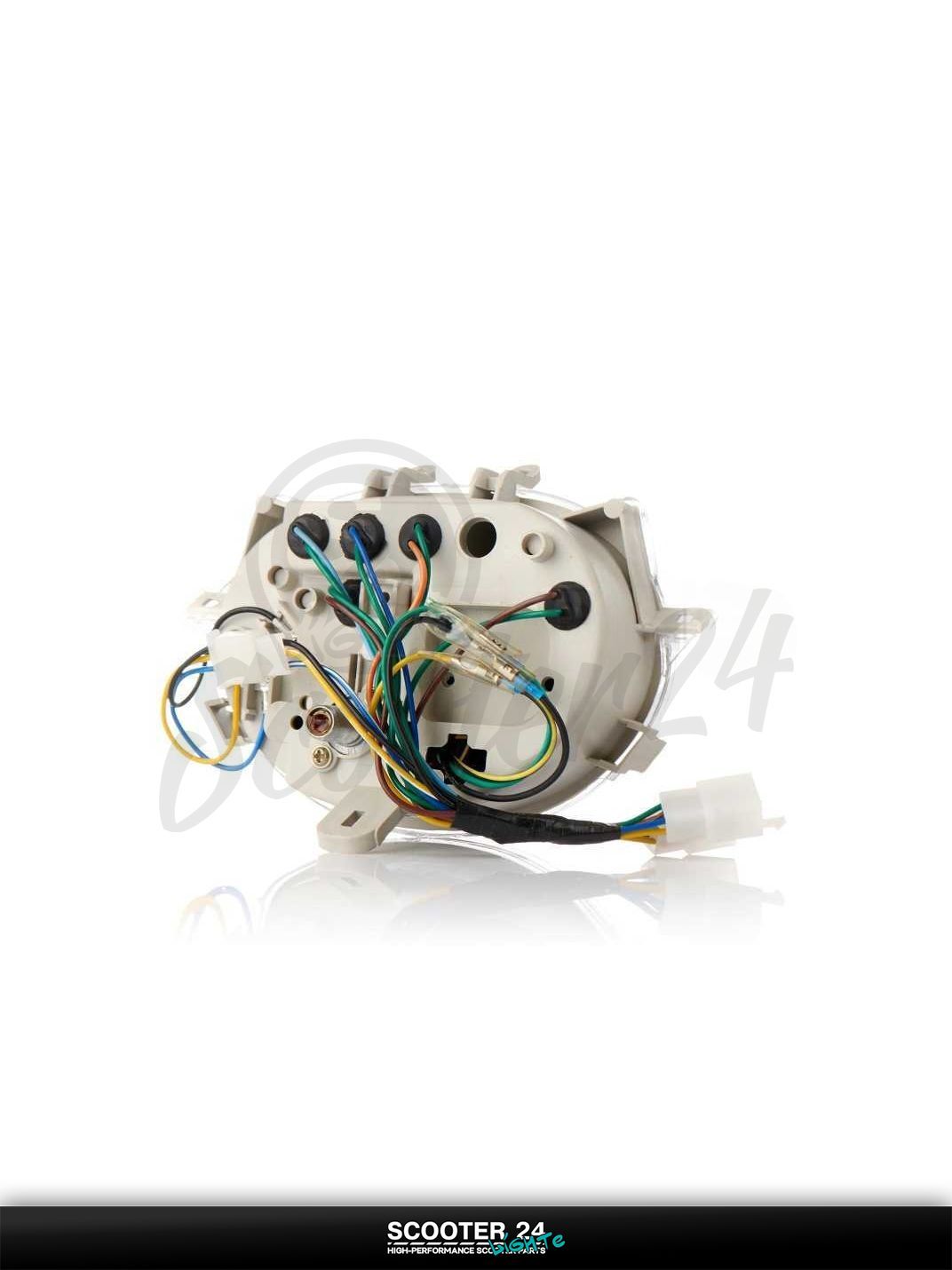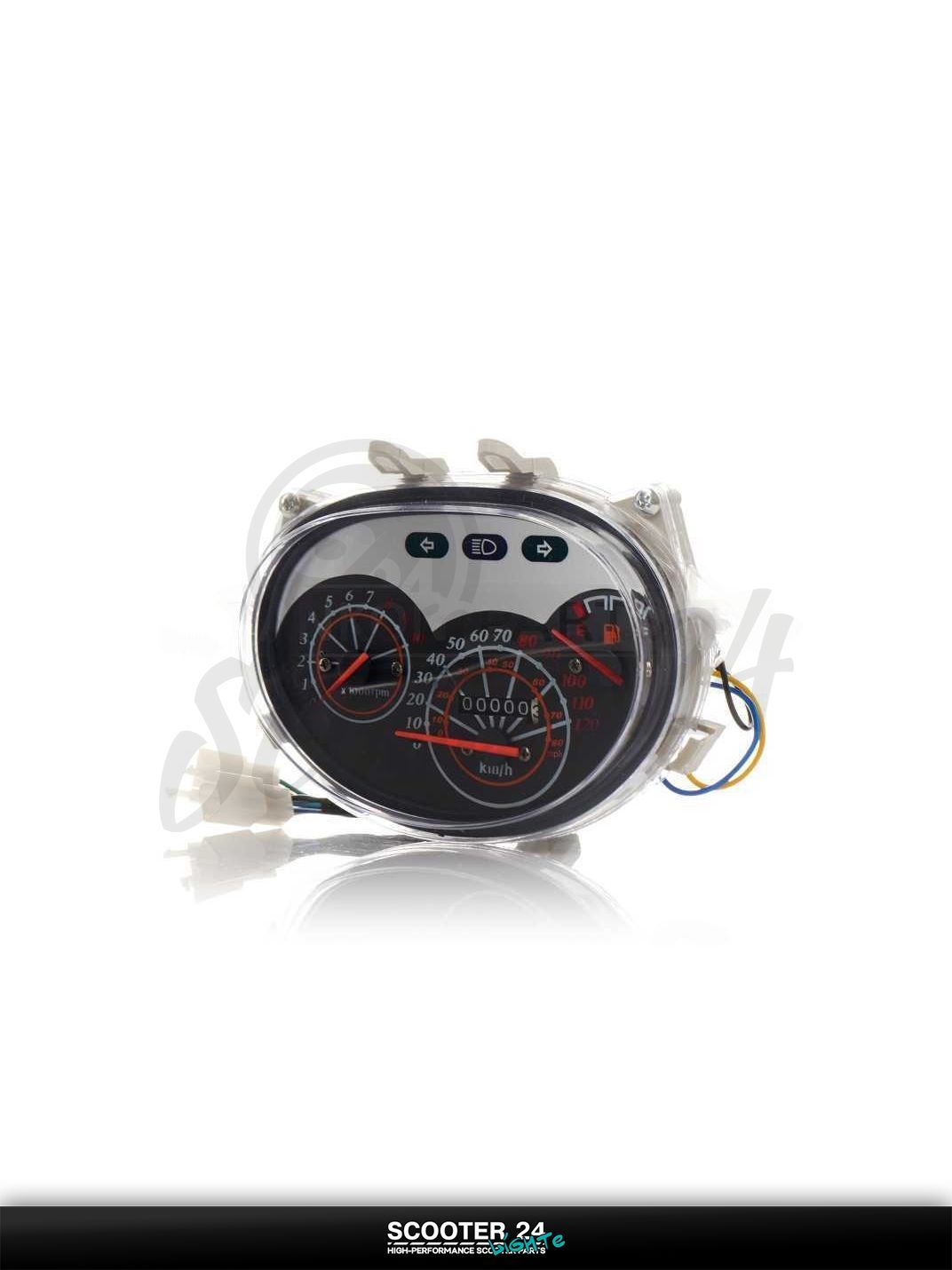 Панель приборов для скутера GRAND PRIX поставляется в сборе со скоростомером, указателем уровня топлива и контрольными индикаторами поворотов, дальнего света и зарядки. Прочная прозрачная линза устойчива к царапинам, равномерная подсветка хорошо читается ночью, штатные разъемы упрощают подключение без доработок проводки. Корпус рассчитан на вибрации и перепады температуры, что важно для ежедневной городской эксплуатации.