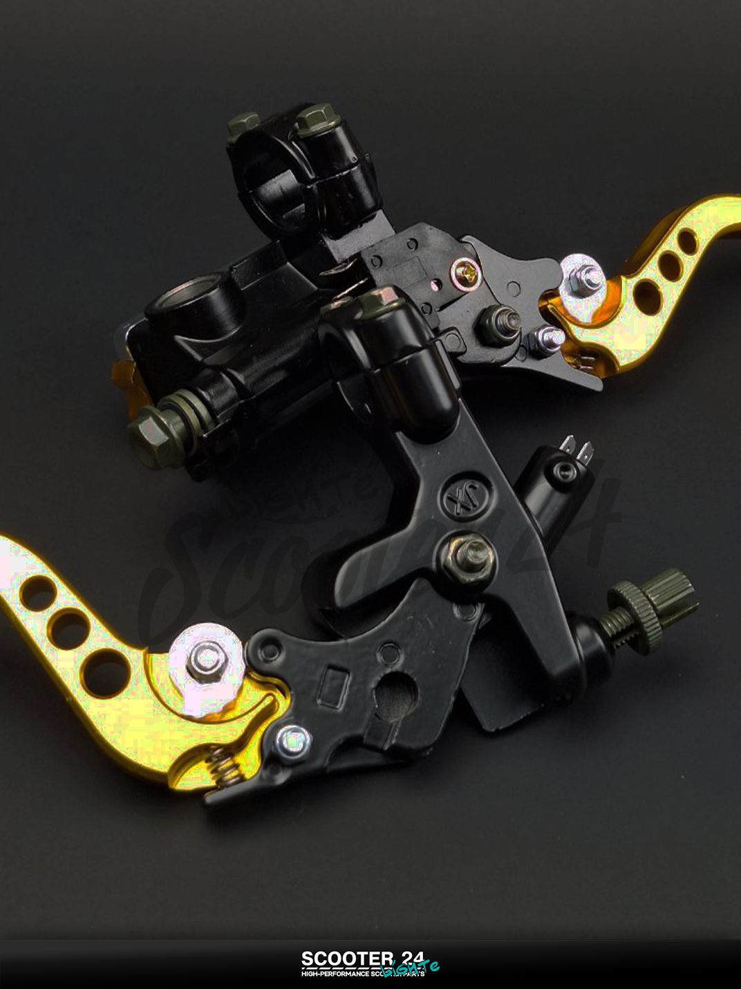 Универсальные рычаги руля с главным тормозным цилиндром (ГТЦ) переднего тормоза в золотом исполнении предназначены для установки на мотоциклы, квадроциклы и скутеры различных марок. Комплект включает пару рычагов и тормозную ручку с интегрированным главным цилиндром, что обеспечивает эффективное и надёжное управление передним тормозом. Эргономичная форма рычагов способствует комфорту водителя и обеспечивает уверенное торможение в любых условиях эксплуатации.